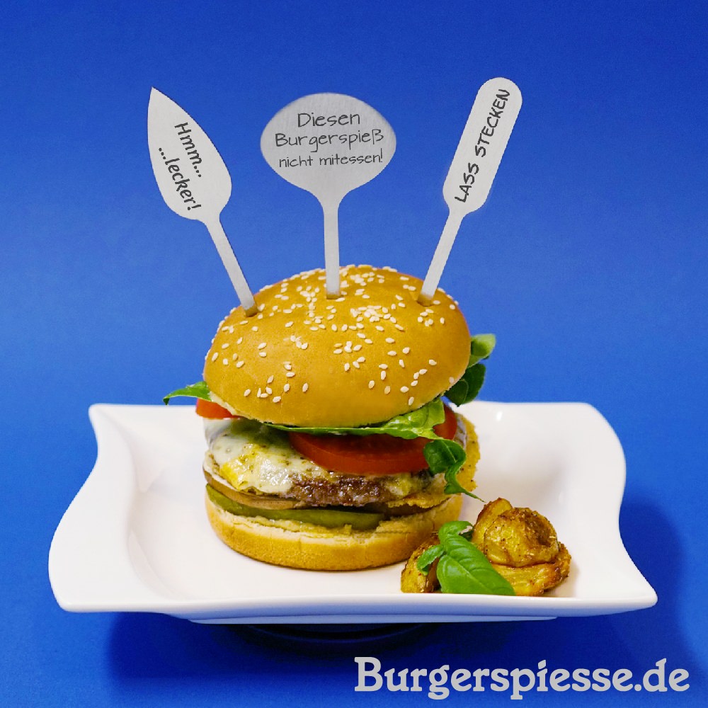Genießen Sie jetzt Ihren Lieblings-Burger mit coolen Hamburgerspießen aus Edelstahl. Diese erhalten Sie bei uns bereits in kleinen Stückzahlen und auf Wunsch inklusive individueller Gravur (z. B. witzige Sprüche, Ihr Firmenlogo u.v.m.) und ausgefallener Geschenkverpackung.